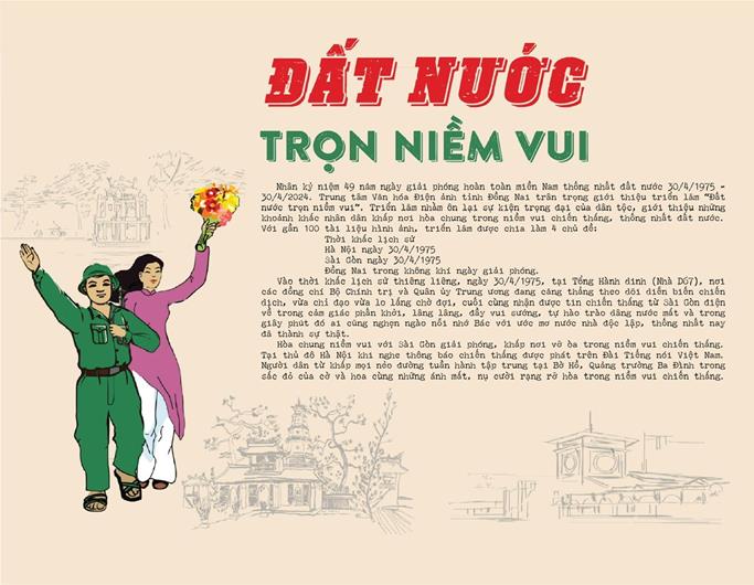 (CTT-Đồng Nai) – Từ ngày 28-4 đến 30-5, Trung tâm Văn hóa - Điện ảnh Đồng Nai trưng bày và giới thiệu triển lãm tài liệu, hình ảnh trực tuyến với chủ đề “Đất nước trọn niềm vui”. Triển lãm hướng đến Kỷ niệm 49 năm Ngày giải phóng hoàn toàn miền Nam thống nhất đất nước 30-4-1975 - 30-4-2024.