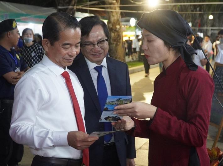 Chủ tịch HĐND tỉnh Thái Bảo và Phó Chủ tịch UBND tỉnh Nguyễn Sơn Hùng tham quan gian hàng giới thiệu về du lịch Phú Thọ tại Tuần lễ VHDLAT