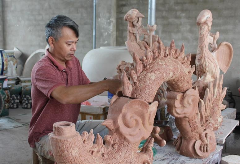 Nghệ nhân Hoàng Ngọc Hiến đang thực hiện hình tượng con rồng bằng gốm Biên Hòa để gắn trên di tích