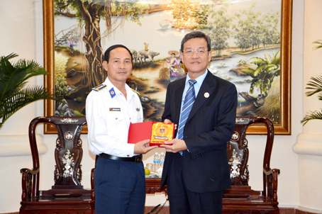 Đại tá Nguyễn Quang Trung, Tư lệnh Vùng Cảnh sát biển 2, tặng biểu trưng cho Chủ tịch UBND tỉnh Đinh Quốc Thái.