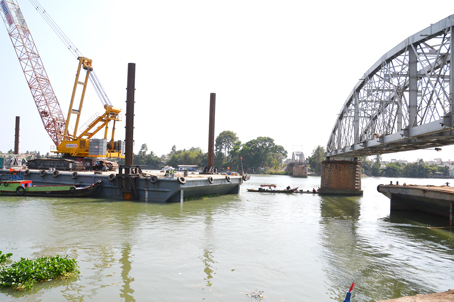 Dưới sông công tác di dời cầu cũ vẫn đang được thực hiện.