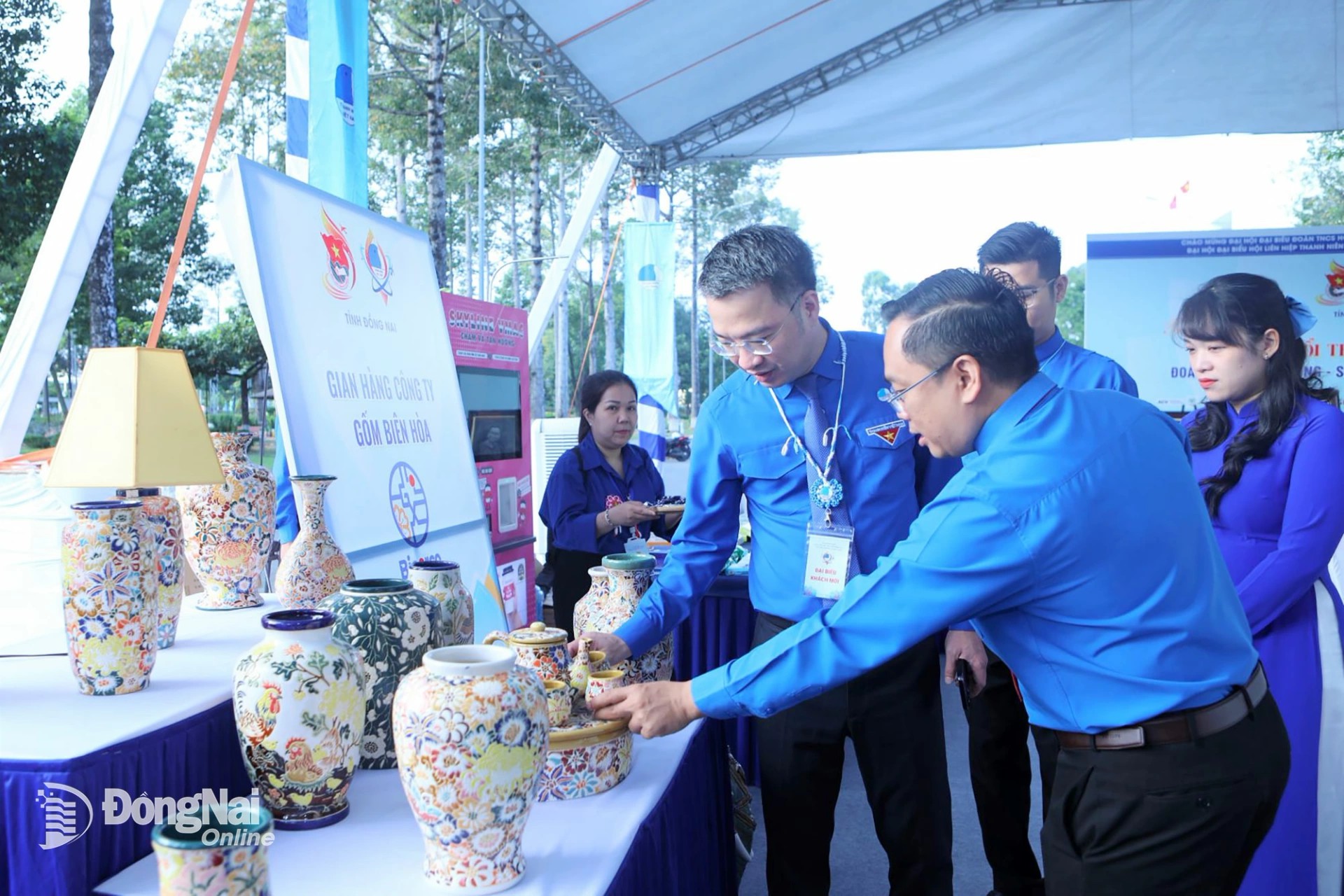 Đồng chí Nguyễn Tường Lâm (đầu tiên từ trái sang), Bí thư Ban Chấp hành Trung ương Đoàn, Chủ tịch Hội Liên hiệp thanh niên Việt Nam tham quan gian hàng trưng bày sản phẩm gốm Biên Hòa bên lề đại hội. Ảnh: Huy Anh