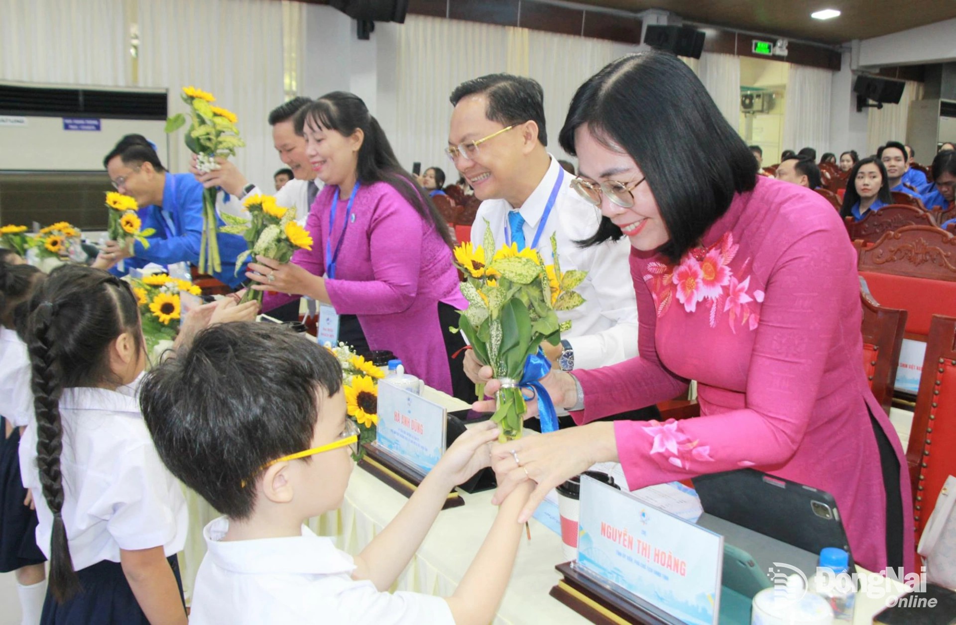 Các đồng chí lãnh đạo tỉnh đón nhận hoa từ các em thiếu nhi đến chúc mừng đại hội. Ảnh: Nguyễn Tuyết