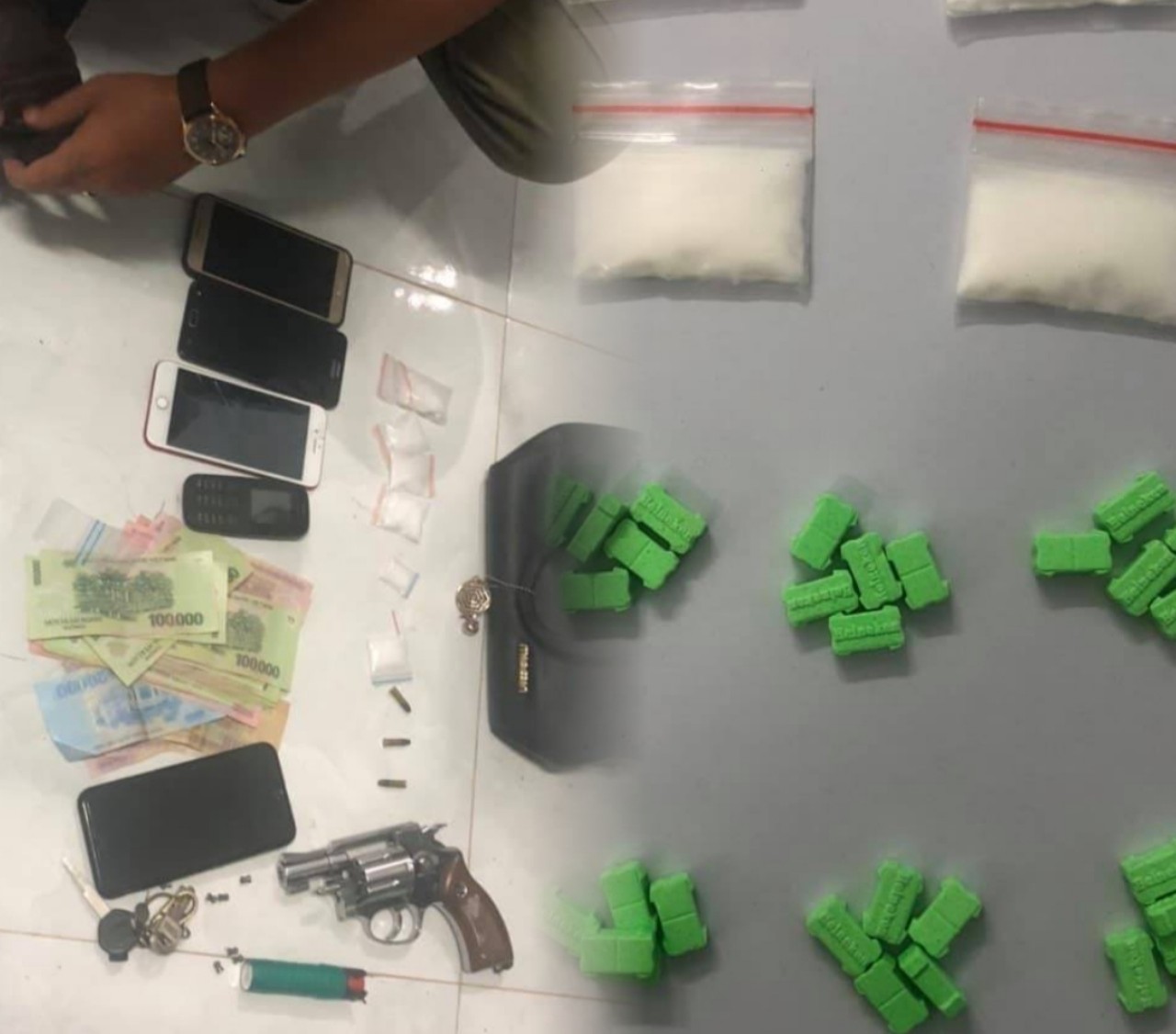 具体6月17日新福县公安的调查罪犯正查队抓住阮青松 (42岁,林同省)在车上有毒品。检查人和车上,公安没收3包毒品重量 243g, 17颗毒品 ( 5,7g以上).公安没收身上的现金是190万,手工枪和8核单。罪犯和毒品都交给了 PC04科继续调查。