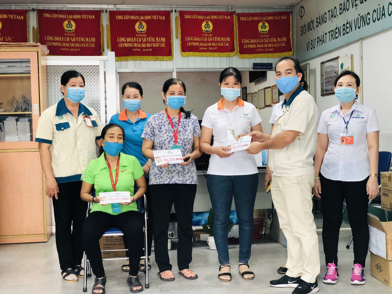 跟着困难的工人同步越南Xích KMC 有限公司来看互助阮氏桥荣140万互助3各孩子上学。荣女士有丈夫在公司工作的了癌症已去世2个月,在她丈夫在治疗的时间工团很多次来互助她家啊治疗。至今,工团干部人员常常来她房间鼓励她越过困难。
