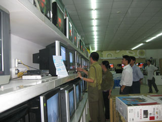 对电子-电器方面,堤岸电器超市从丑牛年元旦节之后也打先锋于一系列活动如 : “ 庆祝超市成立十周年”、“买多少卖多少”,今夏诸多惊人低价产品的“无敌底价”活动也在电器市场上作风作雨。超市承诺如果超市的价格比市场上任何零售店高,就把钱还给顾客。超市热卖的热门商品是松下42寸plasma高清液晶电视只有12.999.000越盾还赠送吸尘器,1200诺基亚手机499.000越盾,高档站式电风扇159.000越盾,Blacker果汁机199.000越盾…。此外,“无敌底价”活动对电视、照相机、冰箱、洗衣器等产品延长至4月16日,不同的产品有不同的优惠,下降从15至50%。