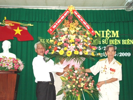 代表同奈省省委、人民议会、人委会、祖国阵线委员会,省委常任副书记同志在会议上向老兵代表赠送鲜花。 |