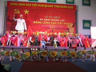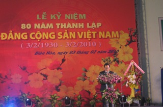 在纪念仪式上,党中央委员、我省省委书记陈廷成发表了回顾越南共产党的光辉历程。80年以前,于1930年02月03日,越南共产党成立,是越南民族发展历程上的光辉标志。从开始成立之后,在义静苏维埃运动中,已经标志着党的领导能力。从革命运动,我党越来越成熟,带领越南人民,胜利地发动了1945年八月革命,成立了越南民主共和国,把我们人民由奴隶成为国家、社会和自己命运的主人,开辟了民族独立与社会主义紧密相连的新纪元。在新阶段,在革命历程上,在越南劳动党领导下,接连战胜法国殖民者和美帝国主义者,解放民族,保卫祖国, 完成了人民民族革命,统一国家,全国向社会主义迈进。以上面所述的胜利,越南成为一个独立、自由、向社会主义发展,国际和地区地位不断提高的国家。今日,在党的领导下,我们人民已经胜利实施了革新事业,将我国由落后的农业国逐步发展成为先进的工业化国家。在80年来我党和人民所得到的成就已经证明越南共产党是越南人民的信任,是劳动人民和工人阶级的先锋队。