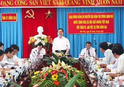 在工作会议上发表讲话,政府总理阮晋勇对同奈省党部和人民在2009年前9个月所做的努力给予高度评价,并肯定:同奈已经有效开展抑制通货膨胀及防止经济衰退工作。他认为,目前世界经济已经初现恢复迹象,国内经济,国内经济也显露转好迹象,因此同奈省要更加努力,力争完成2009年GDP8%的增长目标;为2010年及未来几年继续创造更高的增长机会。他还说,同奈要把握现有的优势,并有效发挥那些优势。对于吸引投资和环保工作,同奈省应避免大量投资,而要选择干净,用高科技和熟练劳动力的项目,以便生产具有高价值的产品或高科技产品。此外,要在各工业区进行建设污水处理厂;兴建废料处理厂等。服务业也是一个同奈省重视发展的行业,尤其是具有高增加值的高级服务。