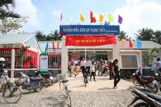 该校由越南嘉吉公司成立的Cargill Cares慈善基金,价值7亿元,有4间教室及国家标准卫生工程,答应安盛水乡120孩子的学习需求,替代被列为危房的老旧教室,让孩子们避免因教室倒塌而受伤,解决了多年以来学校要借用教室情况,并为所有上学年龄孩子创造上学条件。